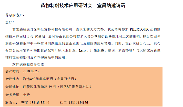 非常感謝您對深圳信宜特科技有限公司一直以來的大力支持,我公司將參加PHEXTOUR藥物制 劑技術巡回研討會宜昌站,屆時將由我們公司技術人員分享制藥設備原理對工藝的影響,探討在固體 制劑研發和生產中一些常見問題出現的真正原因以及相應的應對策略。同時,在此次研討會上,也會 有知名藥用輔料和功能食品配料廠家(亞什蘭、kenry、 廣生膠囊、贏創、羅蓋特等)與大家交流新型 輔料在藥物制劑及營養健康品中的應用。